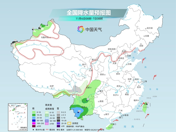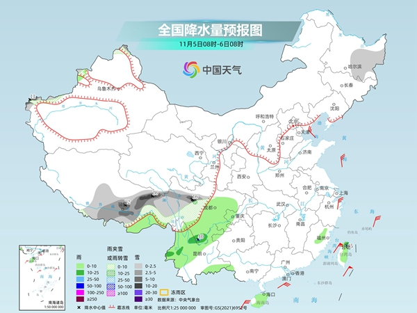 中央氣象臺預(yù)計,今天,黑龍江東部、新疆北疆北部和南疆西部山區(qū)、西藏中部和東部、川西高原等地部分地區(qū)有小雪或雨夾雪,其中,西藏中部和東部、川西高原等地部分地區(qū)有中到大雪,西藏中東部、川西高原中東部等地局地暴雪。西藏東南部、云南中北部、四川中部和南部、重慶西部、海南島、臺灣島大部等地部分地區(qū)有小到中雨,其中,四川南部、臺灣島東北部等地部分地區(qū)有大雨。