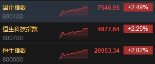 11月7日消息,今日港股三大指數(shù)低開高走,截至收盤,恒生指數(shù)(20953.34, 414.96, 2.02%)漲2.02%,報20953.34點,恒生科技指數(shù)(4677.64, 103.14, 2.25%)漲2.25%,國企指數(shù)漲2.49%。盤面上,科網(wǎng)股普漲,美團漲超5%,騰訊漲超2%,網(wǎng)易漲近2%,百度、阿里巴巴、京東漲超1%;中資券商股午后大幅走強,招商證券(17.34, 2.66, 18.12%)漲超18%;受政策利好提振,餐飲股全天漲幅居前,海倫司(3.32, 0.39, 13.31%)漲超13%;內(nèi)房股集體高漲,世茂集團(1.59, 0.36, 29.27%)漲超29%。