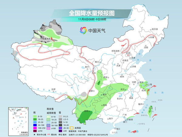 昨天,我國大部地區(qū)降水稀少,降水集中在新疆和西南地區(qū),新疆北部的部分地區(qū)出現(xiàn)小到中雪或雨夾雪,云南中西部出現(xiàn)中到大雨、局地暴雨。
