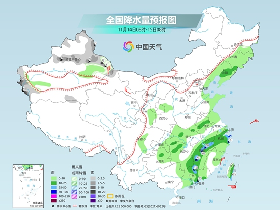 具體來(lái)看,今天新疆北部和西部山區(qū)等地部分地區(qū)有小到中雪或雨夾雪,其中,新疆阿勒泰山區(qū)、沿天山一帶和西部高海拔地區(qū)等地有大到暴雪。東北地區(qū)中南部、西北地區(qū)東部、西南地區(qū)東部、華北東部、黃淮東部、江淮、江漢、江南、華南中部、臺(tái)灣島等地部分地區(qū)有小到中雨,其中,浙江東部、江西北部和西部、廣東北部和南部沿海、臺(tái)灣島東南部等地部分地區(qū)有大雨,局地暴雨。
