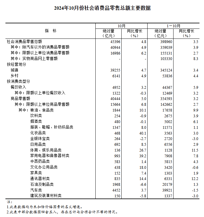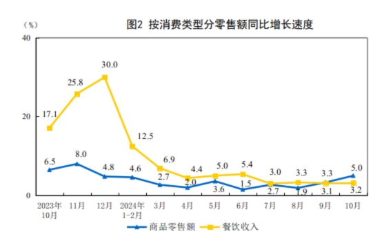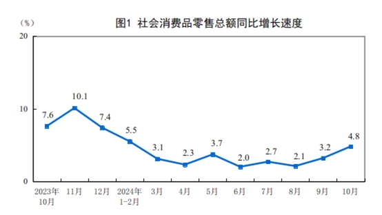2024年10月份社會消費(fèi)品零售總額增長4.8%