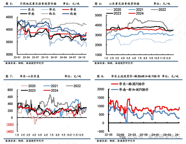本周現(xiàn)貨價格穩(wěn)定回落。截止11月15日,山東重交瀝青現(xiàn)貨價為3475元/噸,環(huán)比11月8日3505元/下跌30元/噸,跌幅1%。其中華北市場跌160元/噸至3305元/噸,華東市場漲50元/噸至3870元/噸,華南市場跌10元/噸至3610/噸。華東-山東價差為395元/噸,環(huán)比上周315元/噸上漲。