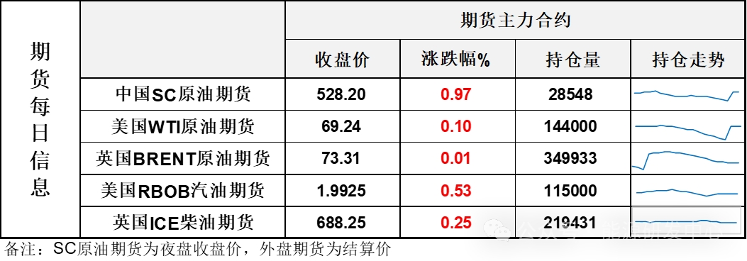 【1】WTI主力原油期貨收漲0.07美元,漲幅0.1%,報69.24美元/桶;布倫特主力原油期貨收漲0.01美元,漲幅0.01%,報73.31美元/桶;INE原油期貨收漲0.97%,報528.2元。