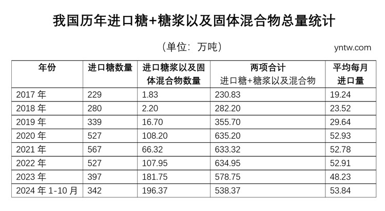 另據(jù)海關總署公布的數(shù)據(jù),2024年10月份我國進口糖54萬噸,1-10月份我國累計進口糖342萬噸,同比上年同期增長12.6%。如果進口糖加上進口糖漿數(shù)量,2024年1-10月份我國進口糖+進口糖漿以及混合物兩項合計高達538.37萬噸,平均每個月進口53.84萬噸。