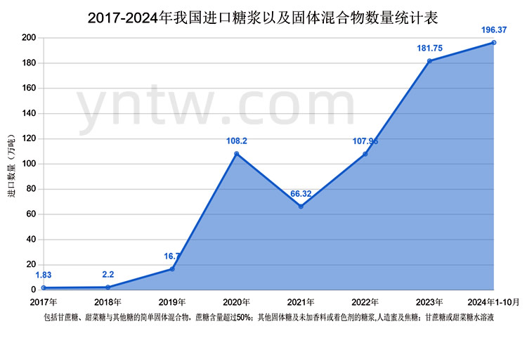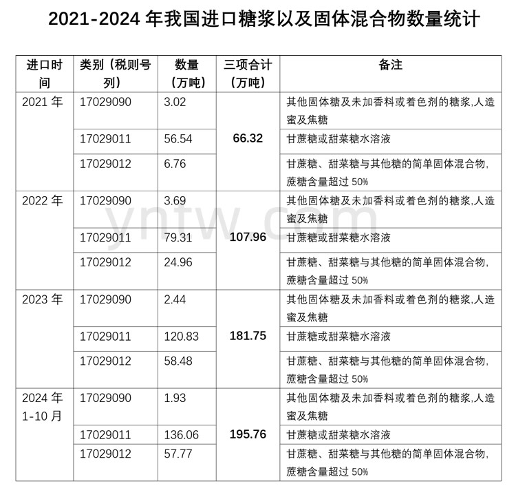 值得注意的是,商品編碼21069062(甘蔗糖、甜菜糖與其他食品原料的簡單固體混合物,蔗糖含量超過50%)自2024年5月份以來進口量大幅增長,月進口數(shù)量超過千噸級別,數(shù)量不可小覷,理應加入統(tǒng)計列表,由此,2024年1-10月份我國進口糖漿以及固體混合物的總的數(shù)量應為195.76萬噸+5538.8噸+562.4噸=196.37萬噸