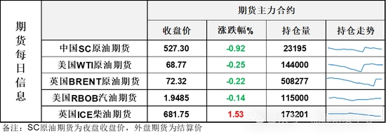 【1】WTI主力原油期貨收跌0.17美元,跌幅0.25%,報68.77美元/桶;布倫特主力原油期貨收跌0.16美元,跌幅0.22%,報72.32美元/桶;INE原油期貨收跌0.92%,報527.3元。