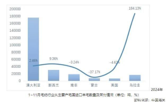 1~11月,行業(yè)進口羊毛量約29.7萬噸,同比增長9.3%,平均進口單價為6.24美元/千克,同比回落9.7%。從澳大利亞、新西蘭進口羊毛數(shù)量分別為17.6和3.1萬噸,同比增長2.5%和9.4%。