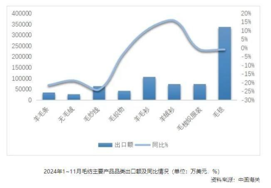 毛紡織出口:1~11月毛紡產(chǎn)品貿(mào)易額保持平穩(wěn)
