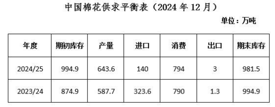中國棉花協(xié)會12月預(yù)測:2024/25年度,全國棉花產(chǎn)量643.6萬噸,同比增長9.5%,根據(jù)新棉采收與加工量測算,將新疆棉花產(chǎn)量上調(diào)至610.4萬噸,較上期上調(diào)8.1萬噸,內(nèi)地未做調(diào)整;棉花進(jìn)口量140萬噸,同比下降56.7%,較上期下調(diào)50萬噸,主要是國內(nèi)資源供給較為充裕,進(jìn)口預(yù)期減少;消費量794萬噸,同比基本持平,較上期下調(diào)6萬噸,新年度以來棉紡織需求較弱,不及先前預(yù)期;期末庫存相應(yīng)調(diào)整為981.5萬噸,同比下降0.1%。