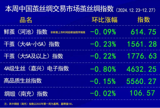 2024 年步入尾聲,本周作為本年度最后一個(gè)完整交易周,繭、絲、綢價(jià)格指數(shù)均呈現(xiàn)出環(huán)比上周的小幅下滑態(tài)勢(shì),市場(chǎng)成交氛圍一般。盡管如此,歲末之際,部分企業(yè)受價(jià)格優(yōu)惠的吸引以及資金狀況的支撐,仍在持續(xù)推進(jìn)年前備貨工作,為新一年的生產(chǎn)經(jīng)營做準(zhǔn)備,市場(chǎng)在平淡中也蘊(yùn)含著一絲節(jié)前的忙碌與期待。