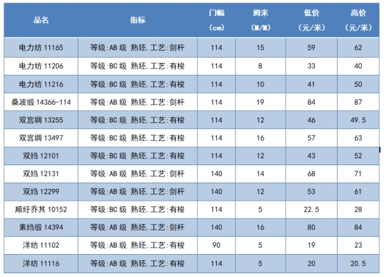 本周綢緞指數(shù)協(xié)作單位成交價(jià)格區(qū)間