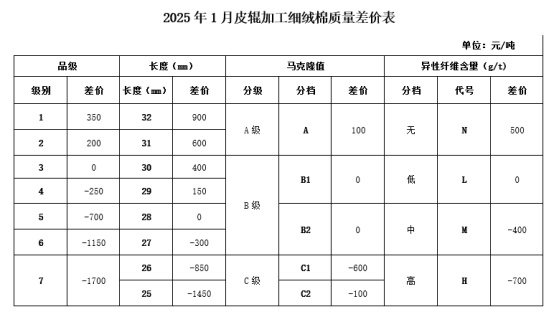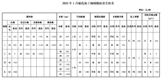 2025年1月《中國棉花協(xié)會國產(chǎn)棉質(zhì)量差價表》發(fā)布