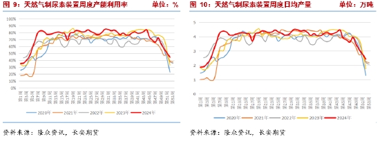分制法來看,天然氣裝置產(chǎn)能利用率44.45%,環(huán)比下降6.33個百分點(diǎn),同比增11.55個百分點(diǎn),日均產(chǎn)量2.43萬噸,環(huán)比減少0.35萬噸,同比增加0.68萬噸,除政策性限氣檢修外,部分西北地區(qū)氣頭裝置因虧損檢修。上周新增四川瀘天化、青海云天化兩套裝置停車,涉及產(chǎn)能110萬噸/年。煤制裝置產(chǎn)能利用率88.25%,環(huán)比下降1.28個百分點(diǎn),同比增長5.22個百分點(diǎn),日均產(chǎn)量15.13萬噸,環(huán)比減少0.22萬噸,同比增加1.25萬噸,中化吉林長山化工停車,未來一周暫無停車計劃,預(yù)計以裝置故障短停為主,另有多套前期停車裝置有重啟計劃,當(dāng)前市場不佳,或?qū)⑼七t,不過需求偏弱,且當(dāng)前日產(chǎn)量仍處同期高位,供給相對仍有壓力。