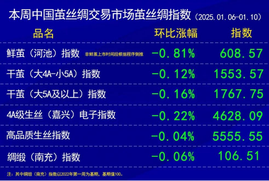 本周繭絲綢各現(xiàn)貨指數(shù)均有不同程度的小幅收跌。