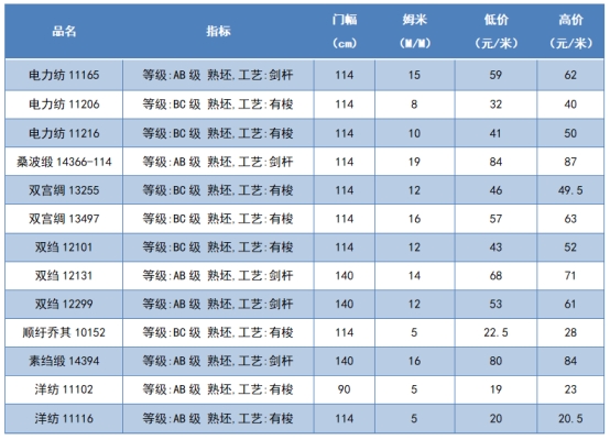本周綢緞指數(shù)協(xié)作單位成交價格區(qū)間