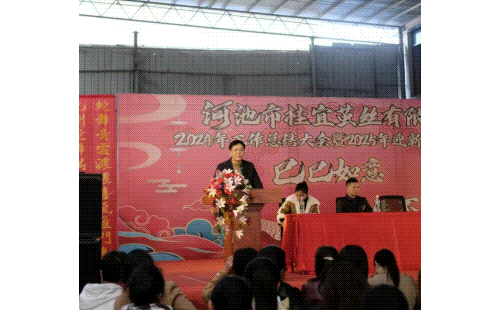 祝賀河池市桂宜繭絲有限公司成立一周年!1月20日,公司2024工作總結大會暨2025迎新答謝晚會舉行,表彰員工、員工抽獎、文藝活動等形式精彩紛呈。