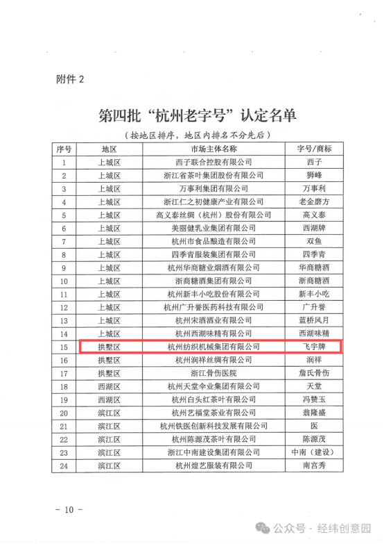 2月7日,杭州市商務(wù)局等4部門聯(lián)合發(fā)文,公布了第四批“杭州老字號”認定名單,杭州紡織機械集團有限公司的“飛宇牌”榜上有名,是兩家機械制造類老字號企業(yè)之一。