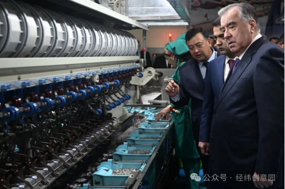2024年4月,塔吉克斯坦總統(tǒng)埃莫馬利·拉赫蒙觀看自動繅絲機生產(chǎn)情況