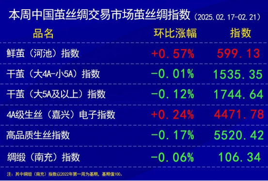 蠶繭指數(shù)上,本周繅絲企業(yè)采購剛需和興趣繼續(xù)維持較低,報(bào)價(jià)較少,經(jīng)過規(guī)則化指數(shù)轉(zhuǎn)換后,本周指數(shù)環(huán)比上周變化不大。