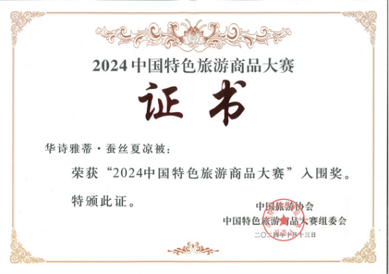 在2024年中國特色旅游商品大賽暨中國旅游商品大賽上,華詩雅蒂創(chuàng)新研發(fā)的蠶絲夏涼被,憑借卓越品質(zhì)與獨特設計,在眾多參賽商品中嶄露頭角,最終榮獲“2024年中國特色旅游商品大賽”入圍獎。