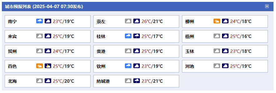 南寧市:今天白天到晚上,陰天有小雨,東南風1~2級,最高氣溫23℃,最低氣溫19℃。