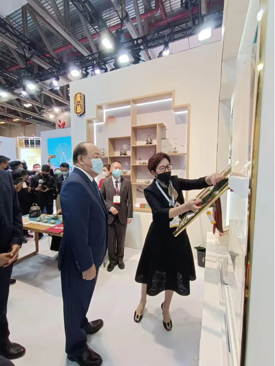 2022年10月,第27屆澳門國際貿(mào)易投資展覽會期間屠紅燕為時任澳門特別行政區(qū)行政長官賀一誠介紹萬事利