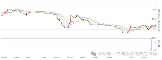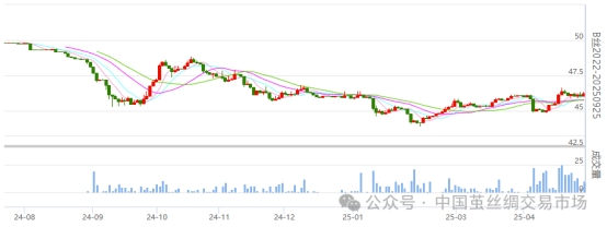 今日(周一)2025繭季的生絲盤面各遠近合約有所收漲,250925合約繼續(xù)增倉。遠月的260425合約及以后的合約價格有略收綠。