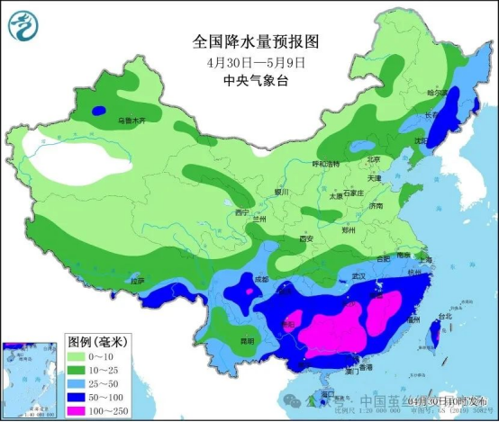 未來10天(4月30日-5月9日),江南南部、華南及四川、貴州、東北地區(qū)東部累計(jì)降水量較常年同期偏多2~6成,局地偏多1倍以上,我國其他大部地區(qū)降水偏少。
