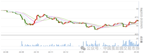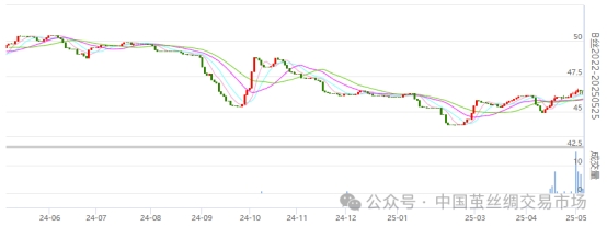 今日(2025年05月08日,周四)中國(guó)繭絲綢交易市場(chǎng)生絲電子指數(shù)上漲0.15%報(bào)收于4656.04點(diǎn)。B絲2022D(商檢4A級(jí)生絲):250525合約報(bào)平收于46.47萬元;250925合約上漲0.12萬元報(bào)收于46.83萬元;260325合約上漲0.12萬元報(bào)收于46.59萬元。