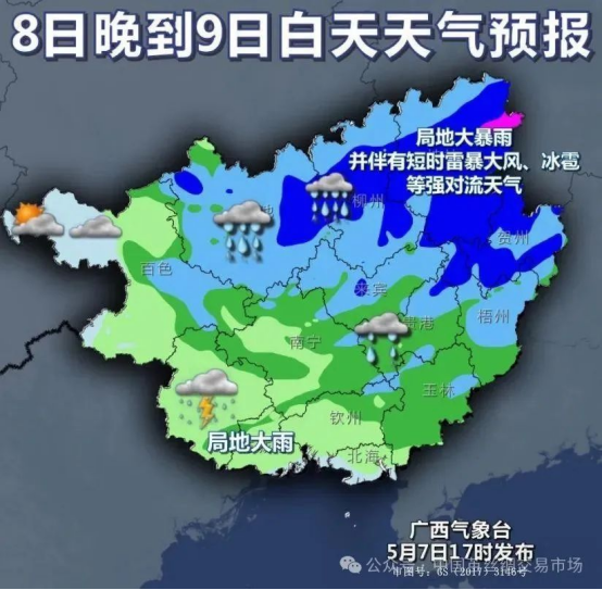 天氣上,5月8日10時(shí),廣西氣象臺(tái)發(fā)布暴雨藍(lán)色預(yù)警,預(yù)計(jì):