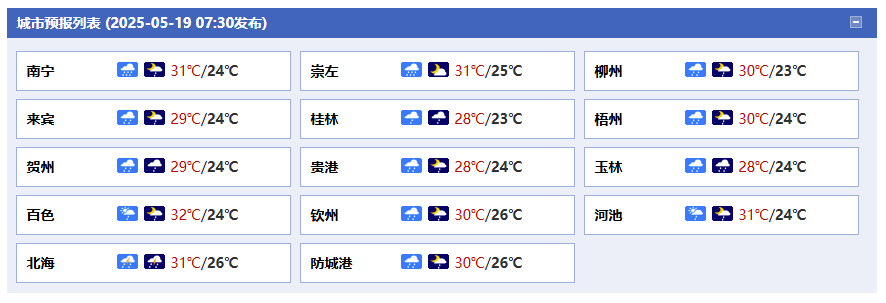 南寧市:今天白天,中到大雨、局地暴雨、降雨時伴有雷電、短時大風等強對流天氣,今天晚上,多云有陣雨或雷雨,偏南風2~3級,最高氣溫31℃,最低氣溫24℃。
