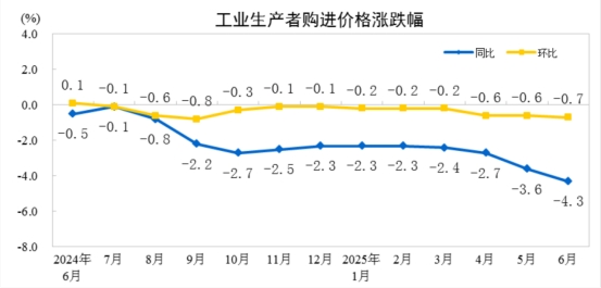 2025年6月份,全國工業(yè)生產(chǎn)者出廠價格同比下降3.6%,環(huán)比下降0.4%;工業(yè)生產(chǎn)者購進價格同比下降4.3%,環(huán)比下降0.7%。上半年,工業(yè)生產(chǎn)者出廠價格比上年同期下降2.8%,工業(yè)生產(chǎn)者購進價格下降2.9%。