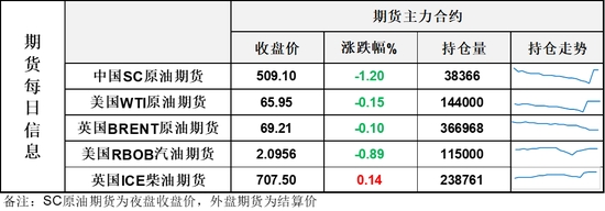 【1】WTI主力原油期貨收跌0.1美元,跌幅0.15%,報65.95美元/桶;布倫特主力原油期貨收跌0.07美元,跌幅0.1%,報69.21美元/桶;INE原油期貨收跌1.2%,報509.1元。