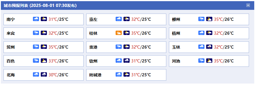今天白天,崇左、防城港、欽州、北海、玉林、梧州、貴港、賀州等市及南寧市南部有中到大雨、局地暴雨或大暴雨并伴有短時雷暴大風(fēng)等強(qiáng)對流天氣,其它地區(qū)多云到陰天有陣雨或雷雨、局地大雨。