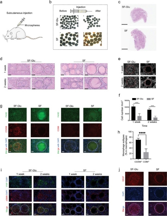 體外注射試驗表明,注射過程中微球之間的擠壓壓力和摩擦力不會破壞微球的球形形貌。在大鼠皮下注射實驗中,SF-Glu 微球展現(xiàn)出驚人的組織整合能力 ——2 周內(nèi),宿主細胞大量涌入微球內(nèi)部,SF-Glu微球中的細胞數(shù)量顯著高于SF微球中的細胞數(shù)量。而普通 SF 微球則被纖維組織包裹,難以與周圍組織融合。SF-Glu微球的多孔結構還對巨噬細胞極化行為有影響,M2巨噬細胞的比例高于M1巨噬細胞。SF-Glu微球中充分的血管化對于保證微球內(nèi)細胞的營養(yǎng)物質(zhì)和代謝廢物的及時交換并維持其功能至關重要。新形成的毛細血管分布在SF-Glu微球內(nèi)部和周圍,而僅存在于SF微球之間的間隙中。