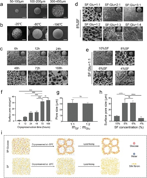 可注射多孔微球是細胞遞送、藥物遞送和組織再生的有前途的治療平臺。然而,具有高度互連多孔結構的絲素蛋白微球的工程仍然是一個未解決的挑戰(zhàn)。已經(jīng)開發(fā)了多種絲素蛋白微球的制備策略,包括噴霧干燥、乙醇和冷凍誘導自組裝、鹽析、油包水乳化等,但這些方法制備的微球互連孔結構低,并不是作為組織重建的細胞載體或支架的理想候選者。一項研究在高壓靜態(tài)噴霧冷凍和凍干相結合的基礎上,選擇葡萄糖作為制孔劑,制備了具有高度互連孔結構的SF微球。該工作以《Engineering Injectable and Highly Interconnected Porous Silk Fibroin Microspheres for Tissue Regeneration》為題發(fā)表在《Advanced Healthcare Materials》上。