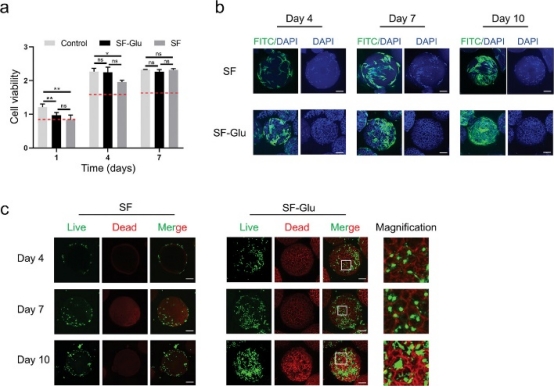 體外實驗中,SF-Glu微球表面粗糙、孔洞豐富,能讓骨髓間充質(zhì)干細胞(BMSCs)更易黏附、增殖,甚至通過孔洞鉆進微球內(nèi)部;而普通SF微球表面光滑,細胞只能零星分布。在相互連接的多孔結構中,細胞之間的相互作用促進了細胞聚集的形成,這可以應用于基于細胞的治療或藥物篩選。