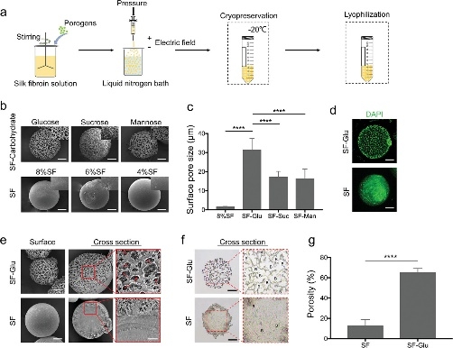 篩選了糖類(葡萄糖、蔗糖、甘露糖和木糖醇)、鹽(NaCl、NH4Cl、KCl)、氨基酸(丙氨酸、甘氨酸、絲氨酸)、酒精和合成聚合物(PEG、PVP)作為致孔劑候選材料。將致孔劑與SF混合,通過高壓靜電噴霧將溶液變成微小液滴,并在液氮中冷凍成球,凍干后用乙醇處理成不溶于水的微球。葡萄糖表現(xiàn)出優(yōu)越的成孔能力,這是由于葡萄糖降低玻璃化轉(zhuǎn)變溫度的能力及其獨特的分子結構。葡萄糖-SF(SF-Glu)微球的平均表面孔徑(31.3±6.1μm)顯著大于SF(1.5±0.4μm),SF-Glu微球的孔隙率明顯高于SF微球(64.9±4.3%vs.12.5±6.4%)。大小均勻的高度互連的孔結構分布在SF-Glu微球的表面和內(nèi)部,微球表明未表現(xiàn)出任何開裂跡象,分布在SF-Glu微球中的絲素蛋白材料的密度小于SF微球中觀察到的密度。