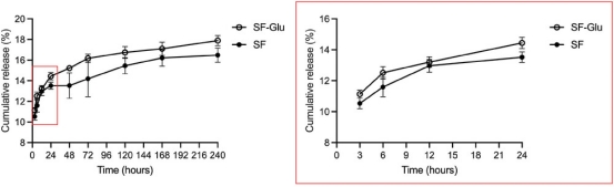 作為藥物載體,SF-Glu微球和普通SF微球一樣能持續(xù)釋放模型藥物(如 BSA),前3小時僅有少量“爆發(fā)釋放”,之后10天內(nèi)穩(wěn)定釋放,說明其能長效發(fā)揮藥效。