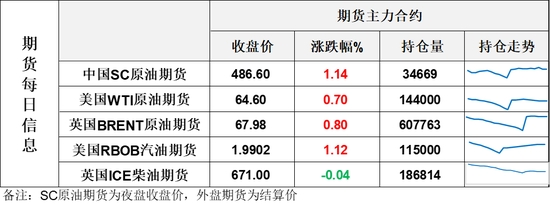 【1】WTI主力原油期貨收漲0.45美元,漲幅0.7%,報(bào)64.6美元/桶;布倫特主力原油期貨收漲0.54美元,漲幅0.8%,報(bào)67.98美元/桶;INE原油期貨收漲1.14%,報(bào)486.6元。