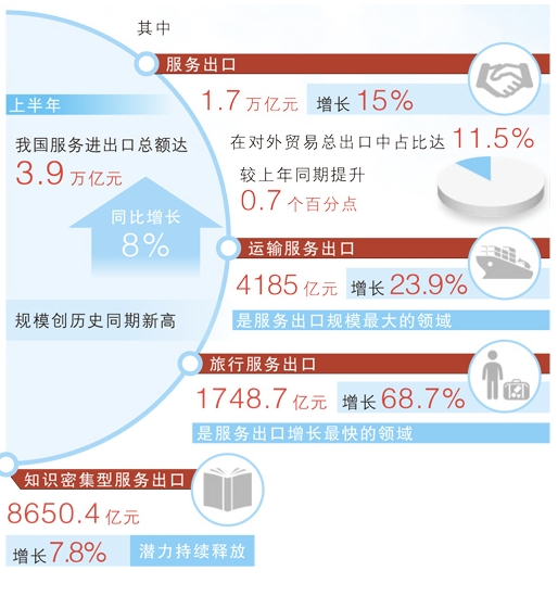 據(jù)新華社北京8月27日電 (記者謝?,帲┙衲晟习肽?,我國服務(wù)進出口總額創(chuàng)歷史同期新高,旅行服務(wù)進出口規(guī)模超過1萬億元,增速達到12.3%。預(yù)計全年服務(wù)貿(mào)易仍將保持增長,貿(mào)易結(jié)構(gòu)將持續(xù)優(yōu)化。