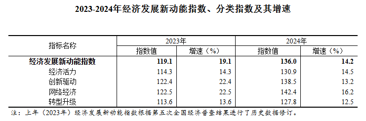 為動(dòng)態(tài)監(jiān)測(cè)我國(guó)經(jīng)濟(jì)發(fā)展新動(dòng)能變動(dòng)情況,國(guó)家統(tǒng)計(jì)局統(tǒng)計(jì)科學(xué)研究所基于《新產(chǎn)業(yè)新業(yè)態(tài)新商業(yè)模式統(tǒng)計(jì)監(jiān)測(cè)制度》,采用定基指數(shù)方法測(cè)算了2024年經(jīng)濟(jì)發(fā)展新動(dòng)能情況指數(shù)。結(jié)果顯示,2024年我國(guó)經(jīng)濟(jì)發(fā)展新動(dòng)能指數(shù)(以2022年為100)為136.0,比上年增長(zhǎng)14.2%。2024年,各項(xiàng)分類指數(shù)與上年相比均有提升,其中,網(wǎng)絡(luò)經(jīng)濟(jì)和創(chuàng)新驅(qū)動(dòng)對(duì)總指數(shù)增長(zhǎng)的貢獻(xiàn)較大。