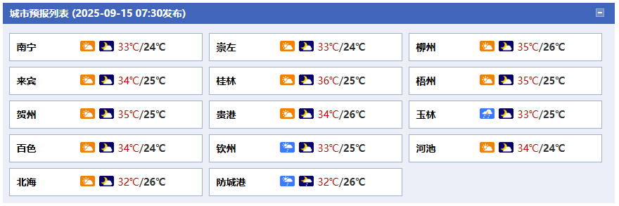 預(yù)計未來三天,我區(qū)大部以多云到晴為主。今天白天,百色、崇左、防城港、欽州、北海、玉林等市有分散陣雨或雷雨、局地大雨或暴雨。今天晚上,百色、欽州、防城港等市有分散陣雨或雷雨、局地大雨或暴雨。16日白天到17日晚上,部分地區(qū)會有分散陣雨或雷雨、局地大雨。未來三天,全區(qū)大部最高氣溫33~35℃、局地37℃以上。