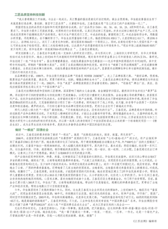 兩代人的匠心傾力把“一根絲”做到極致。“只有被淘汰的企業(yè),沒有消失的行業(yè)”,王春花說,品牌是通向市場的路,科技創(chuàng)新是產(chǎn)品和品牌的發(fā)動(dòng)機(jī),只有用匠心精神抓好這兩者,才能讓企業(yè)踏準(zhǔn)市場節(jié)奏,擁有強(qiáng)盛的生命力。從蠶種的培養(yǎng),到對蠶絲絲長和彈力的探索,華佳不斷創(chuàng)新、尋找最優(yōu)解。目前,華佳已建立包括國家級博士后工作站、江蘇省繭絲改性與加工工程技術(shù)研究中心在內(nèi)的4所相關(guān)研發(fā)機(jī)構(gòu),并以第一起草人的身份制定了中絲協(xié)團(tuán)標(biāo)委成立以來的第一個(gè)標(biāo)準(zhǔn)制定項(xiàng)目——《精品生絲》,成為業(yè)界生絲技術(shù)標(biāo)準(zhǔn)參考,是歐洲眾多奢侈品品牌在中國區(qū)的指定供應(yīng)商。