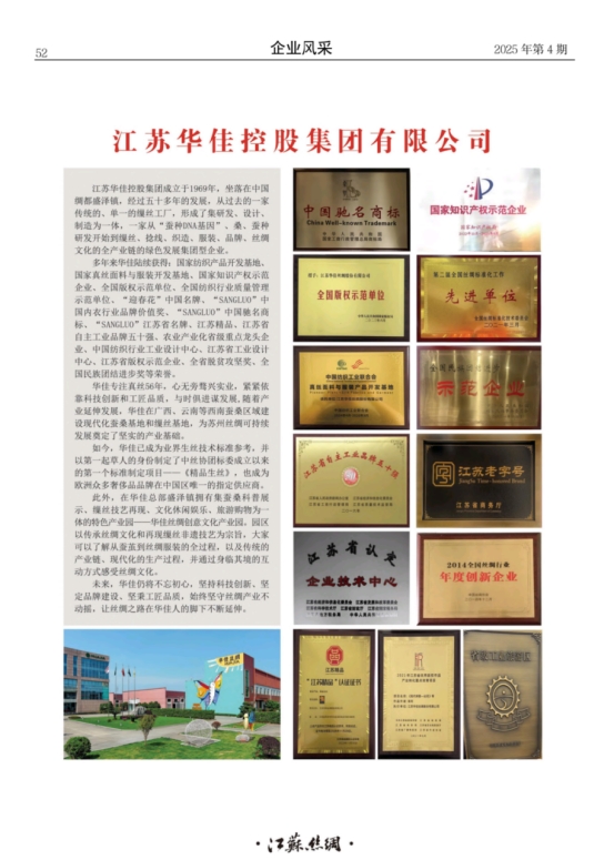 江蘇華佳控股集團(tuán)成立于1969年,坐落在中國綢都盛澤鎮(zhèn),經(jīng)過五十多年的發(fā)展,從過去的一家傳統(tǒng)的、單一的繅絲工廠,形成了集研發(fā)、設(shè)計(jì)、制造為一體,一家從“蠶種DNA基因”、桑、蠶種研發(fā)開始到繅絲、捻線、織造、服裝、品牌、絲綢文化的全產(chǎn)業(yè)鏈的綠色發(fā)展集團(tuán)型企業(yè)。