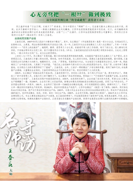 吳江盛澤有著“日出萬綢,衣被天下”的美譽(yù),作為中國四大“綢都”之一,見證著無數(shù)本土繅絲企業(yè)的興衰。然而,在歲月磨礪中堅(jiān)守初心、一路做大做強(qiáng)的企業(yè)鳳毛麟角,江蘇華佳控股集團(tuán)就是其中佼佼者。近日,本刊編輯來到盛澤采訪全國繭絲綢行業(yè)終身成就獎(jiǎng)獲得者、全國“三八”紅旗手、江蘇華佳控股集團(tuán)有限公司董事長、蘇州吳江區(qū)非物質(zhì)文化遺產(chǎn)(繅絲技藝)傳承人王春花。