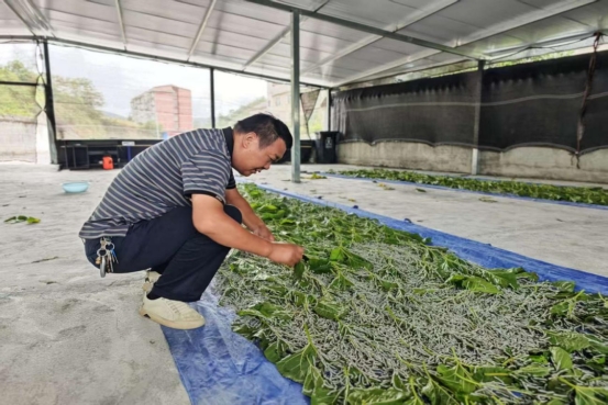 石硐村黨支部書記何甲兵查看蠶寶寶生長情況