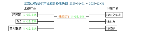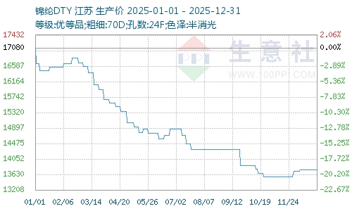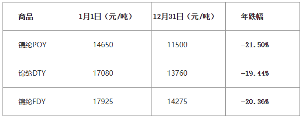 以錦綸DTY為例,從年初 17080 元 / 噸,一路下跌至 11 月的 13560 元 / 噸,全年最大跌幅達 20.61%;僅在 12 月小幅回升至 13760 元 / 噸,整體處于近五年低位。
