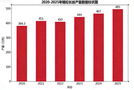 近幾年錦綸長絲產(chǎn)量穩(wěn)中持漲,2023年中國錦綸長絲產(chǎn)量達到444萬噸,同比上升8.29%;2024年錦綸長絲產(chǎn)量為467萬噸,同比上升5.18%。2025年錦綸長絲產(chǎn)量為495萬噸,同比上升近6.00%。近3年,我國錦綸長絲年產(chǎn)量都已超過400萬噸,占全球總產(chǎn)量的三分之一左右。