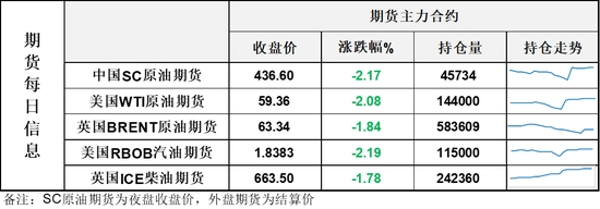 【1】WTI主力原油期貨收跌1.26美元,跌幅2.08%,報(bào)59.36美元/桶;布倫特主力原油期貨收跌1.19美元,跌幅1.84%,報(bào)63.34美元/桶;INE原油期貨收跌2.17%,報(bào)436.6元。